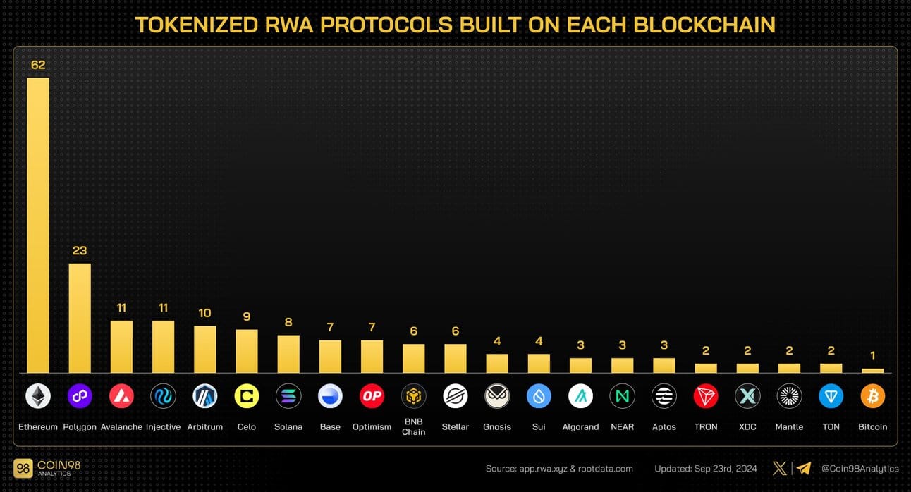 Tokenized RWAs are seeing the most protocols being built on Ethereum, Polygon, Avalanche and Injective, according to Coin98 Analytics (chart below)