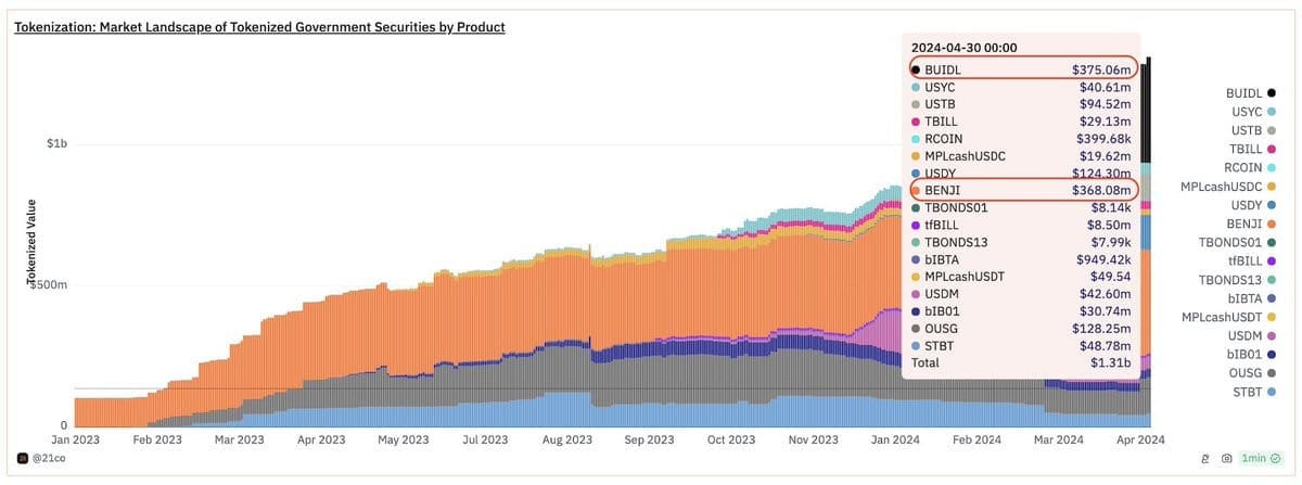 Speaking of BlackRock…its BUIDL tokenized offering is the largest tokenized treasury fund at $375M, making up almost 30% of the $1.3B tokenized Treasury market in about six weeks (CoinDesk)