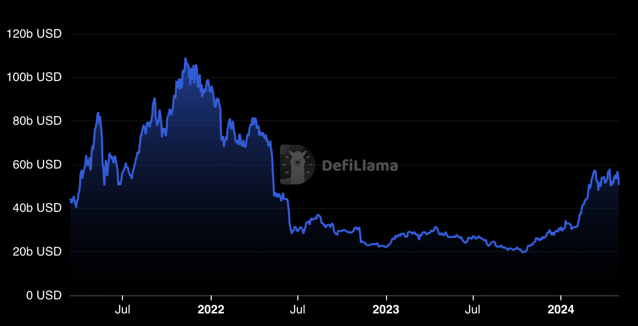 Even with prices down, Ethereum DeFi total value locked (TVL) has been seesawing around $50.5B, the highest range since May 2022.